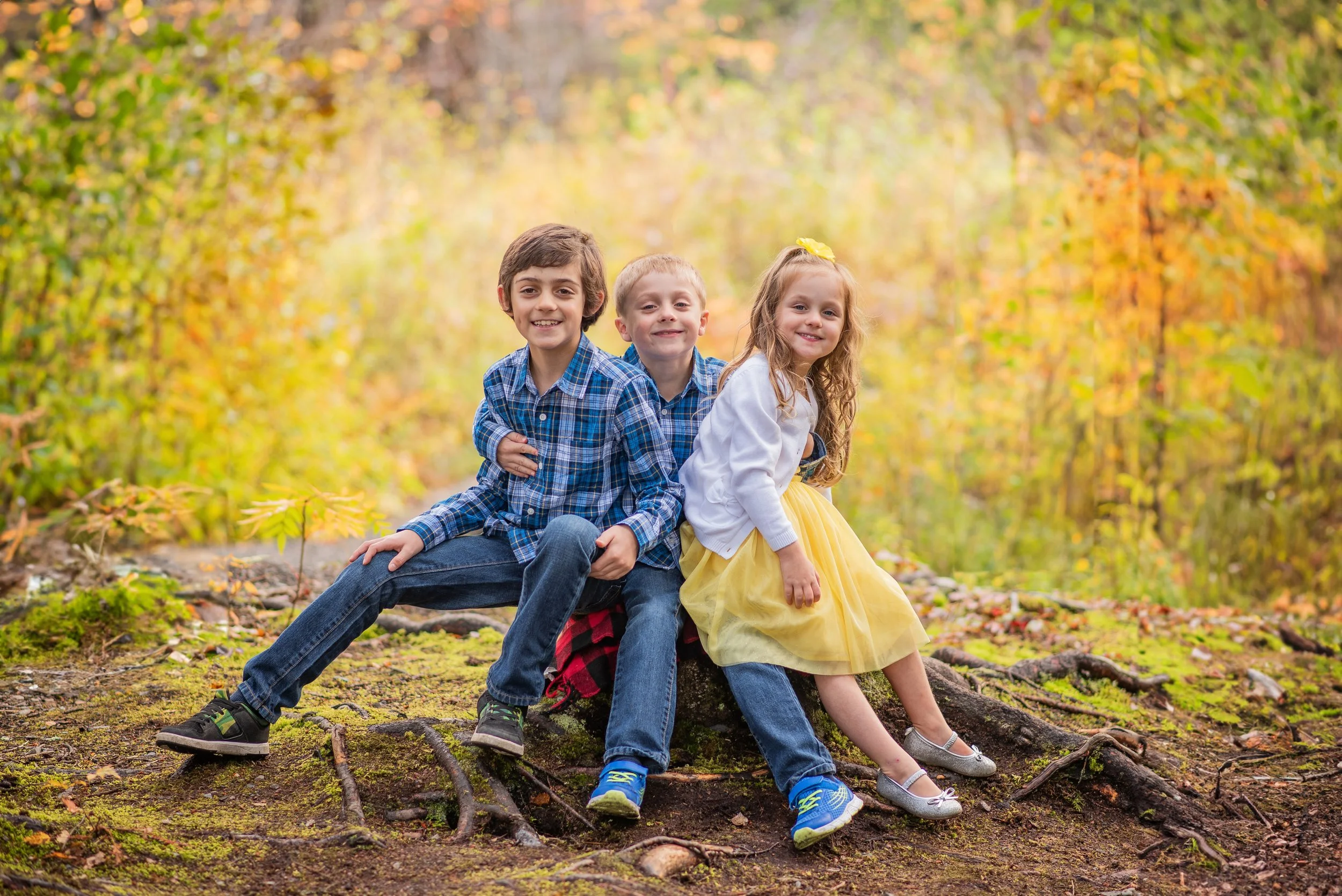3 siblings sit on a tree stump smiling and laughing for a photo at the  lewisporte train park