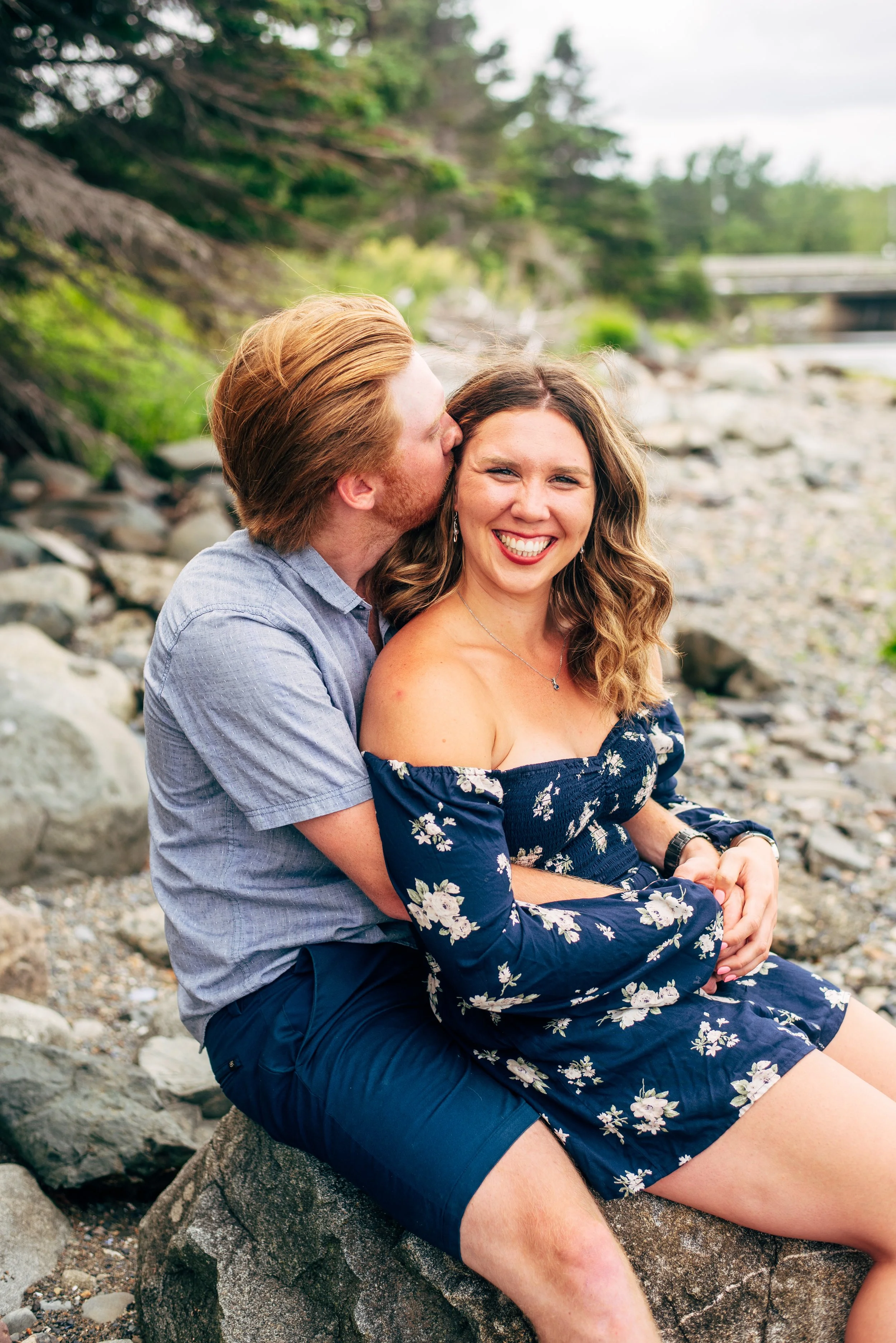 a man and woman sitting on a rock at the beach, man is whispering in womans ear at old mill in campbelton