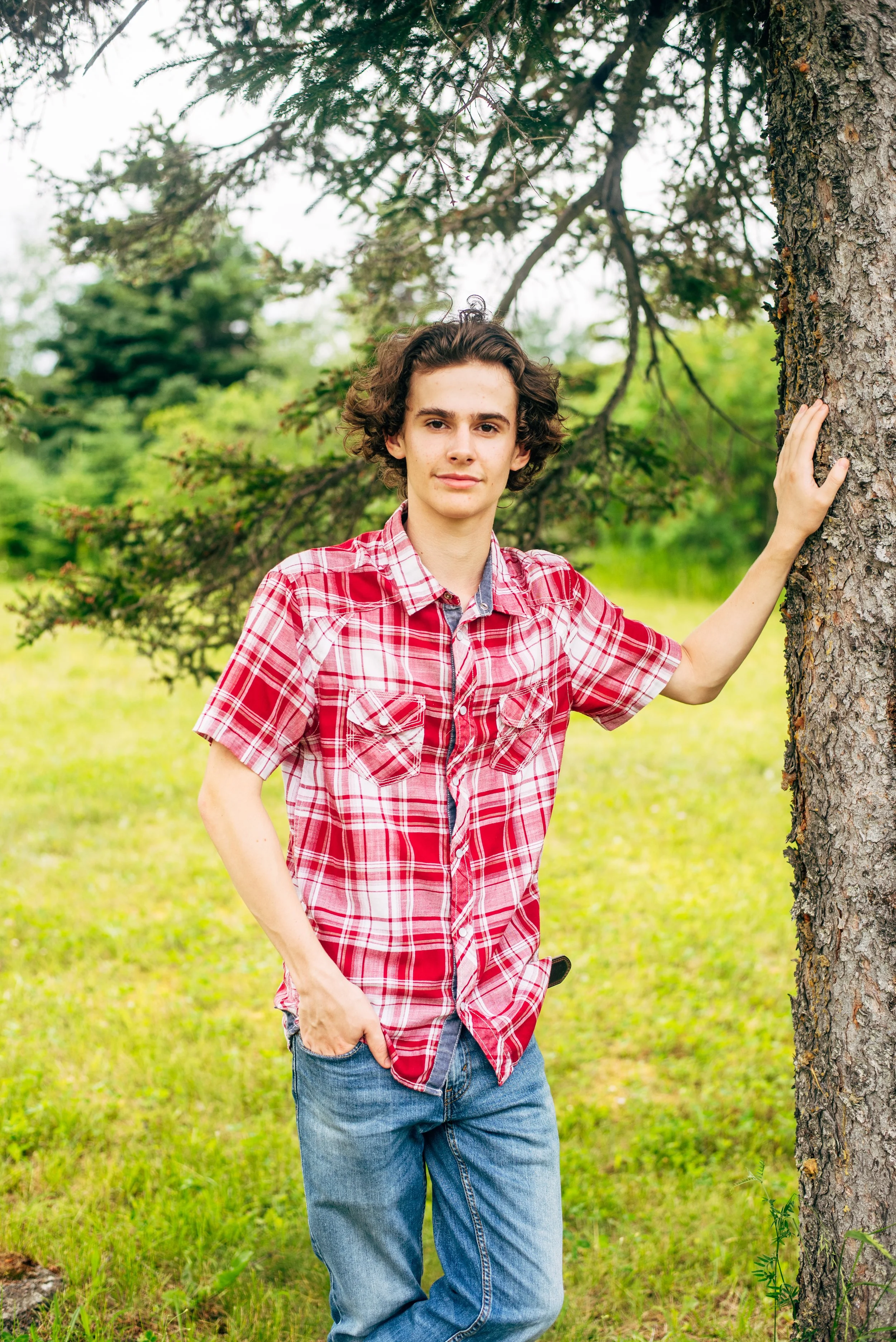 a young man is standing by a tree with his hand on the tree for a photo at old mill in campbelton
