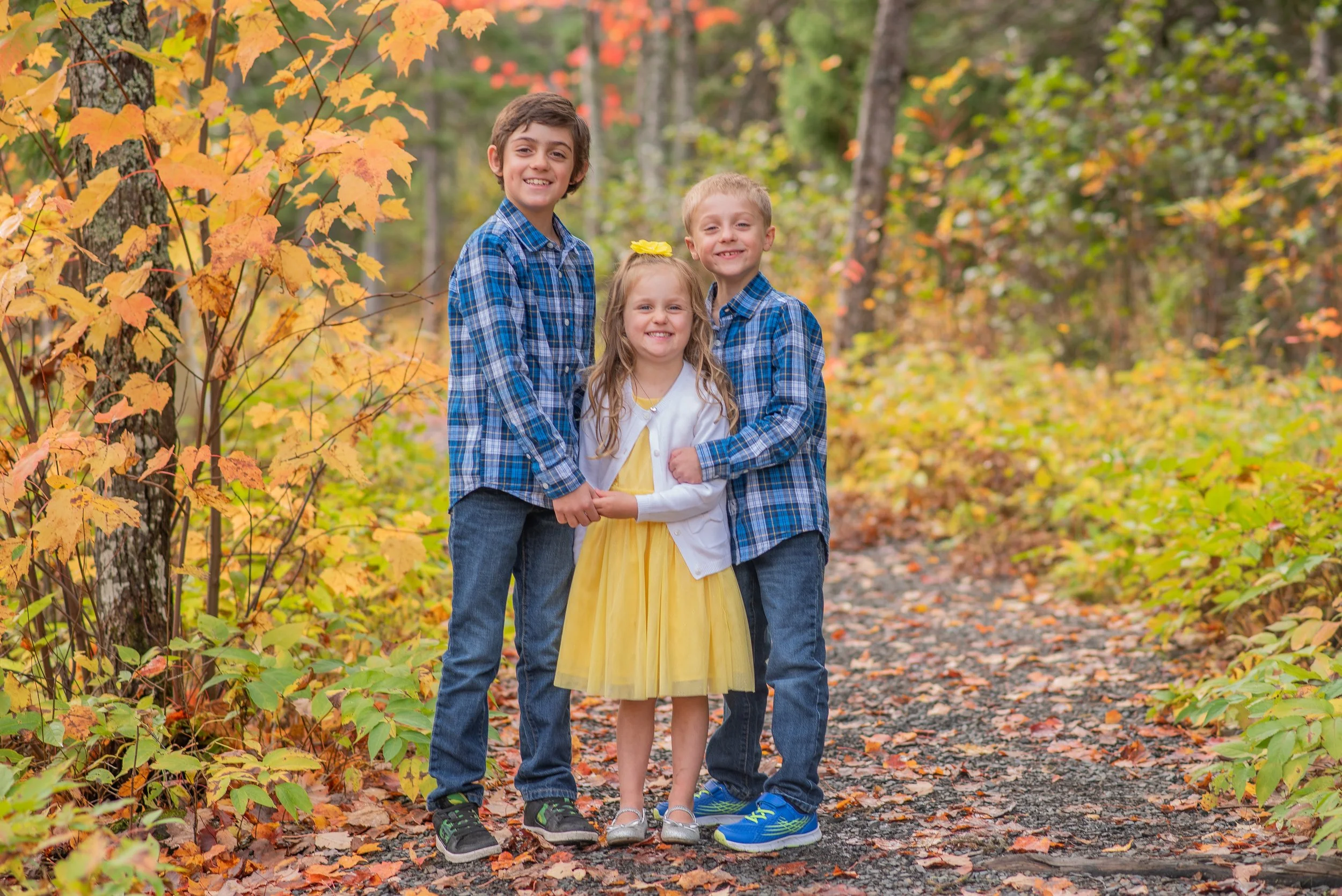 3 siblings stand together and pose for a photo outside in fall at  lewisporte train park