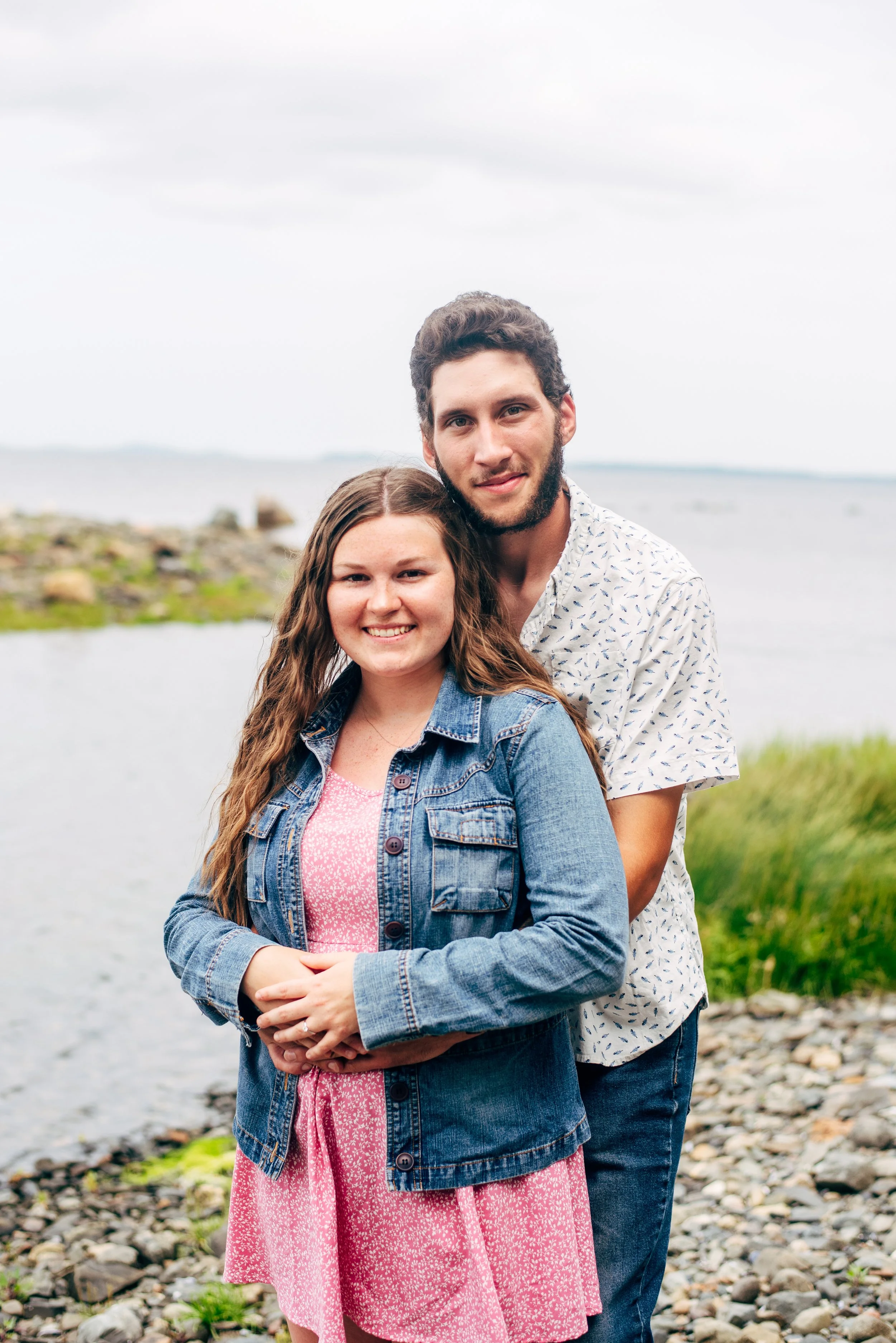 a man embraces his fiancé from behind in a loving embrace for an engagment photo at old mill in campbelton